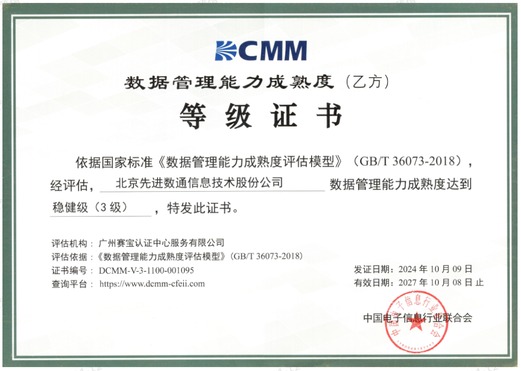 近期,中国电子信息行业联合会公布了最新一批顺利获得数据管理能力成熟度(DCMM)贯标等级认证的企业名单。PA视讯国际成功取得数据管理能力成熟度稳健级(三级)认证。这一认证的取得,标志着PA视讯国际在数据治理体系构建和数据管理与应用能力方面,已经达到了国家权威组织认可的标准。这不仅是对PA视讯国际在数据管理领域专业能力的肯定,也是对其在有助于数字化转型服务和数据驱动决策方面所做努力的认可。